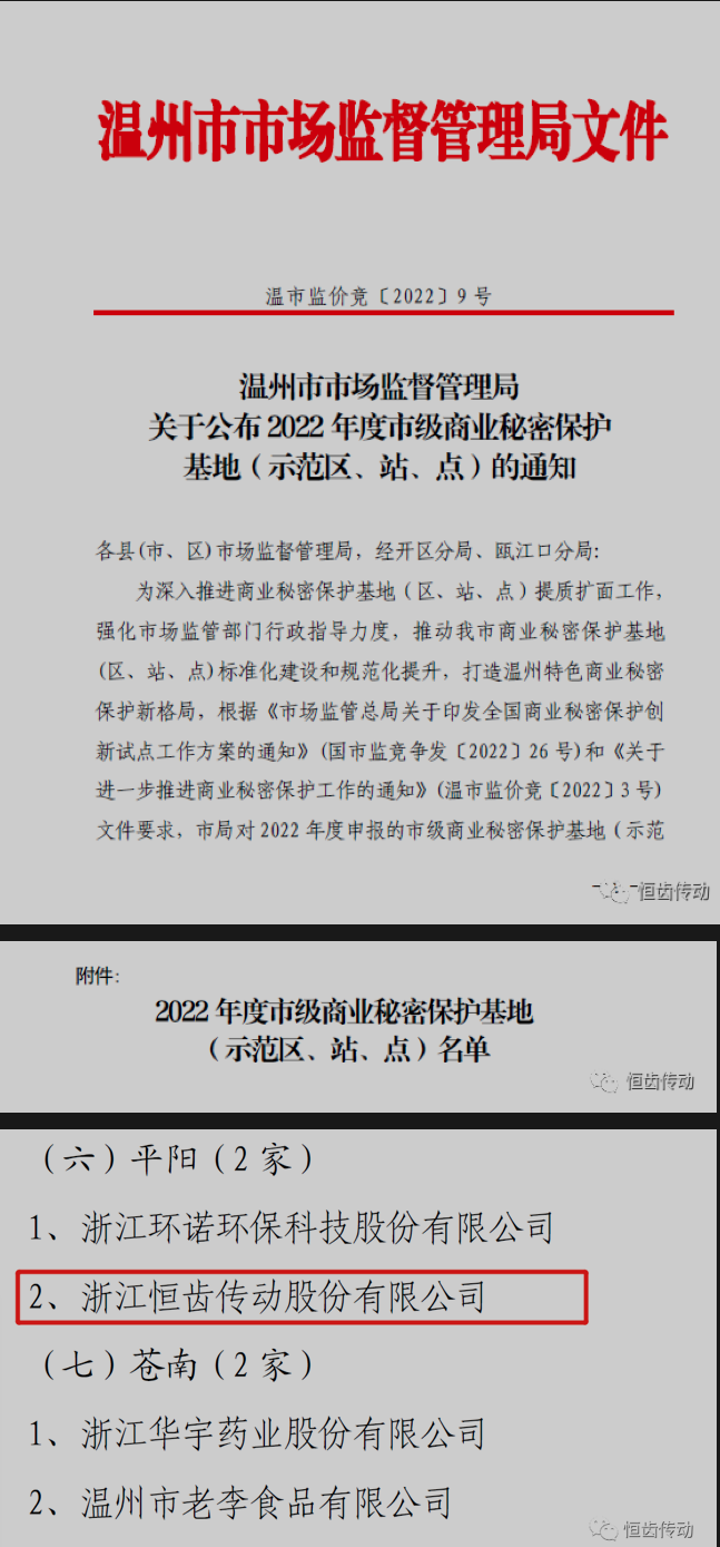 近日,市局對(duì)2022年度申報(bào)的市級(jí)商業(yè)秘密保護(hù)基地區(qū)、站、點(diǎn),進(jìn)行了實(shí)地檢查驗(yàn)收。經(jīng)驗(yàn)收評(píng)估,浙江恒齒傳動(dòng)股份有限公司成功入選市級(jí)商業(yè)秘密保護(hù)示范點(diǎn)。